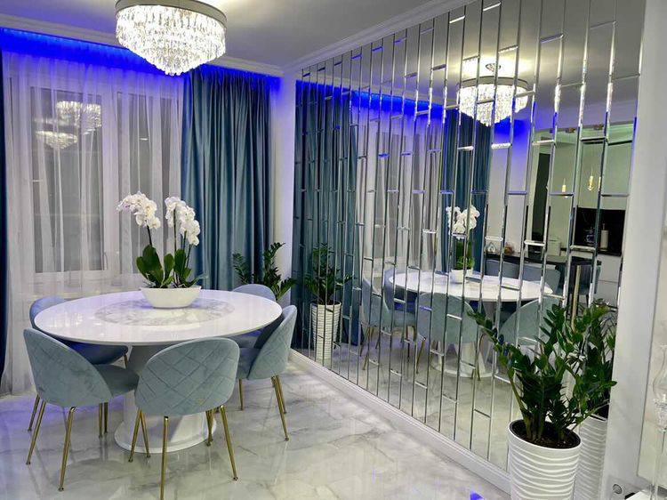 Использована квадратная серебристая зеркальная плитка размером 18х18.